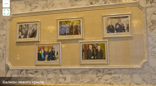 Третий момент, который обращает на себя во время виртуального тура, – «фотовыставка важнейших событий в истории Беларуси». На деле на стенах дворца видны лишь фотографии с участием самого Лукашенко.