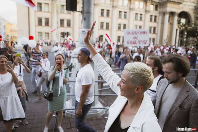 В марше приняли участие и известные белорусы. Мария Колесникова еще была на свободе. Сегодня, через год, ее вместе с юристом Знаком судят в закрытом режиме.