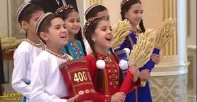 Дети в убранстве и с песнями докладывают правителю про урожай зерновых
