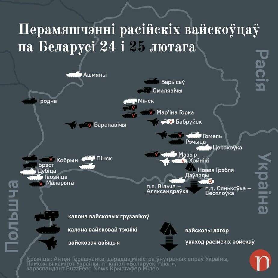 Мы собрали сведения о перемещении российских войск по территории Беларуси, которые доступны в открытых источниках. Брали только те факты, которые подтверждаются одновременно несколькими фото или видео.