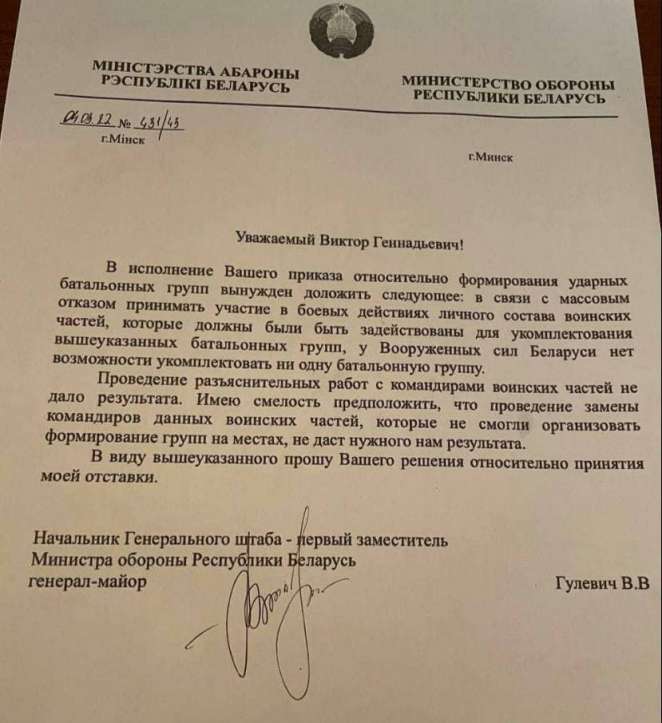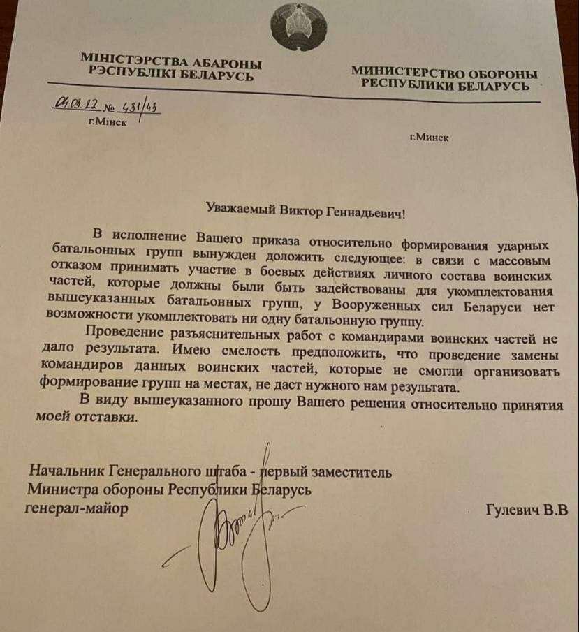 Украинский журналист Андрей Цаплиенко сообщил в своем Telegram-канале информацию о том, что начальник Генштаба Беларуси Виктор Гулевич подал в отставку, написав:
