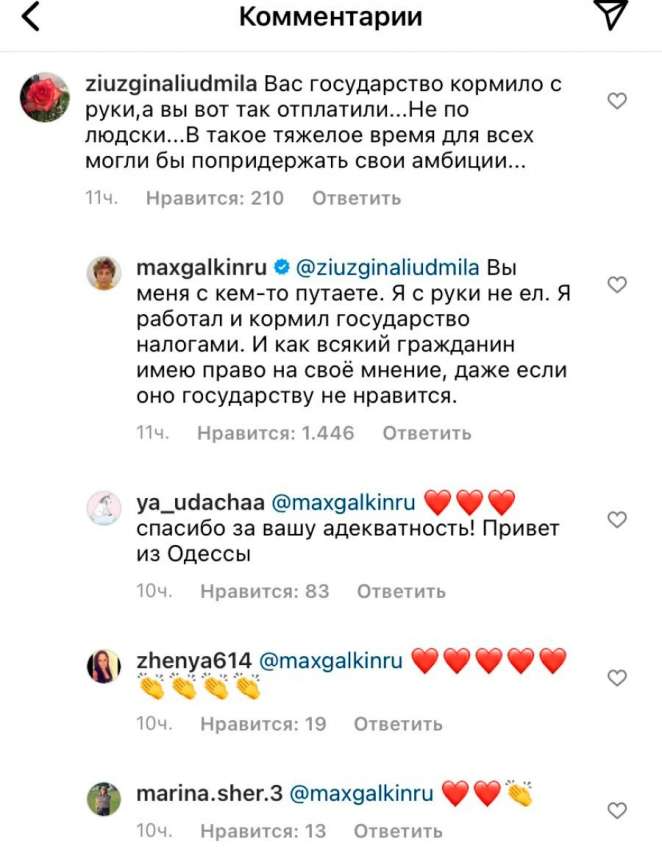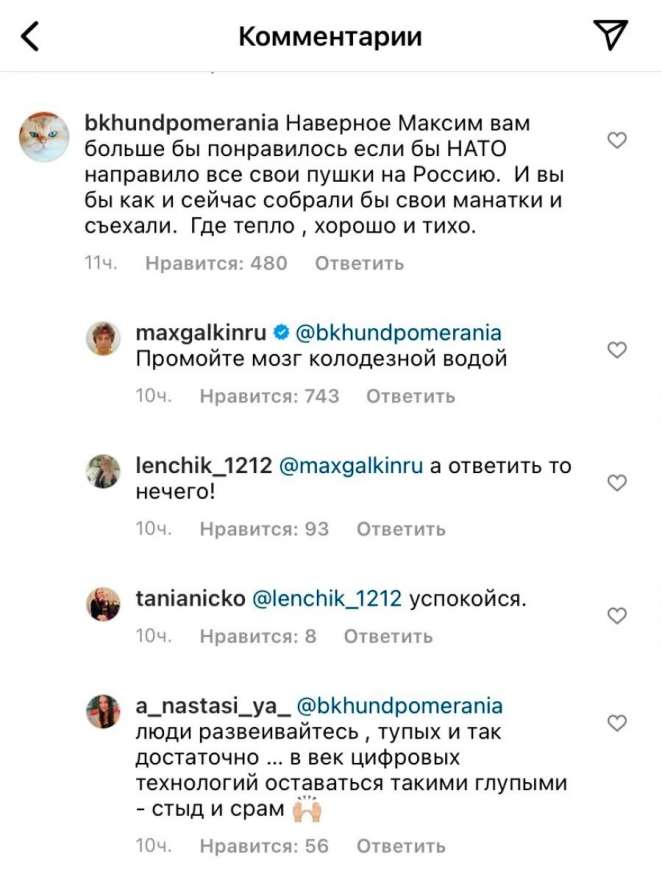 В новом посте в Instagram Галкин решил ответить на критику. Одна пользовательница написала, что «Максим наверняка бы обрадовался, когда НАТО напало бы на Россию». На что шоумен ей ответил: «Промойте мозг колодезной водой», — отметил он.