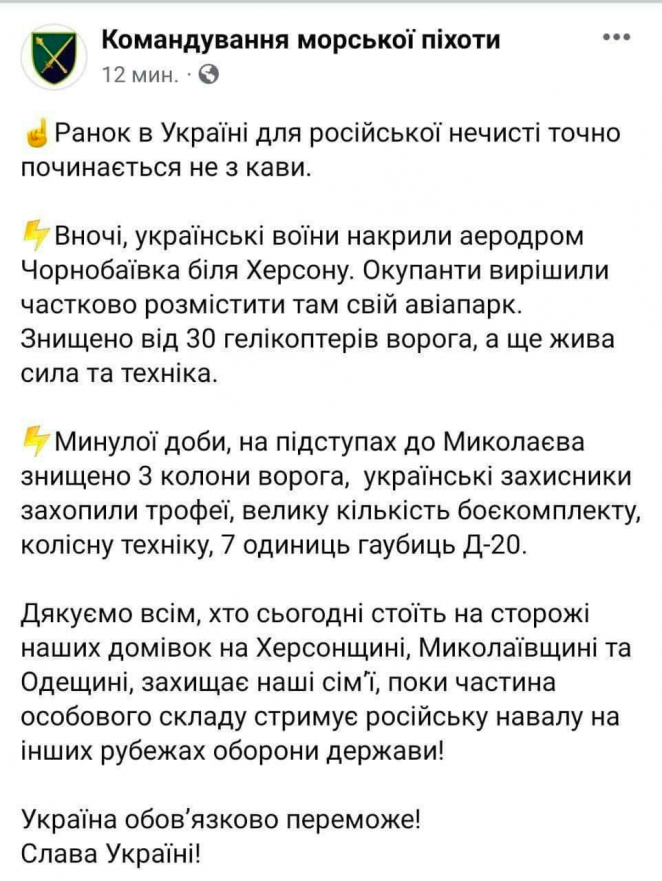 Как сообщает командование морской пехоты Украины, за ночь было уничтожено 30 российских вертолетов над Херсонской областью. Оккупанты хотели разместится на местном аэродроме, но не получилось. Также была уничтожена живая сила и техника врага.