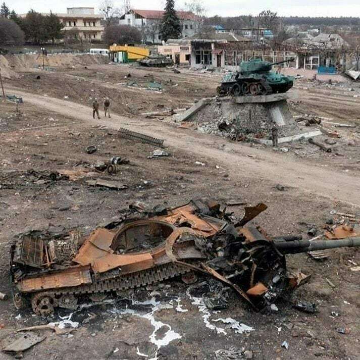 Освобожденный из-под российской оккупации город Тростенец Сумской области. Уничтоженный российский танк возле памятника освобождению от нацистов. Фото @ressentiment_channel