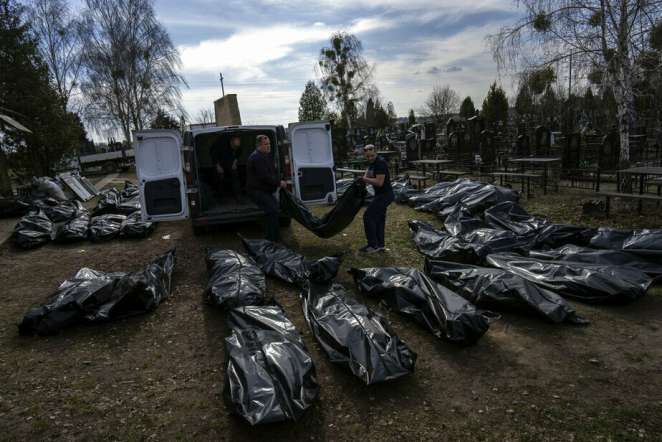 Работники кладбища выгружают тела погибших мирных жителей на кладбище в Буче, 7 апреля 2022 г. Фото: Rodrigo Abd / AP