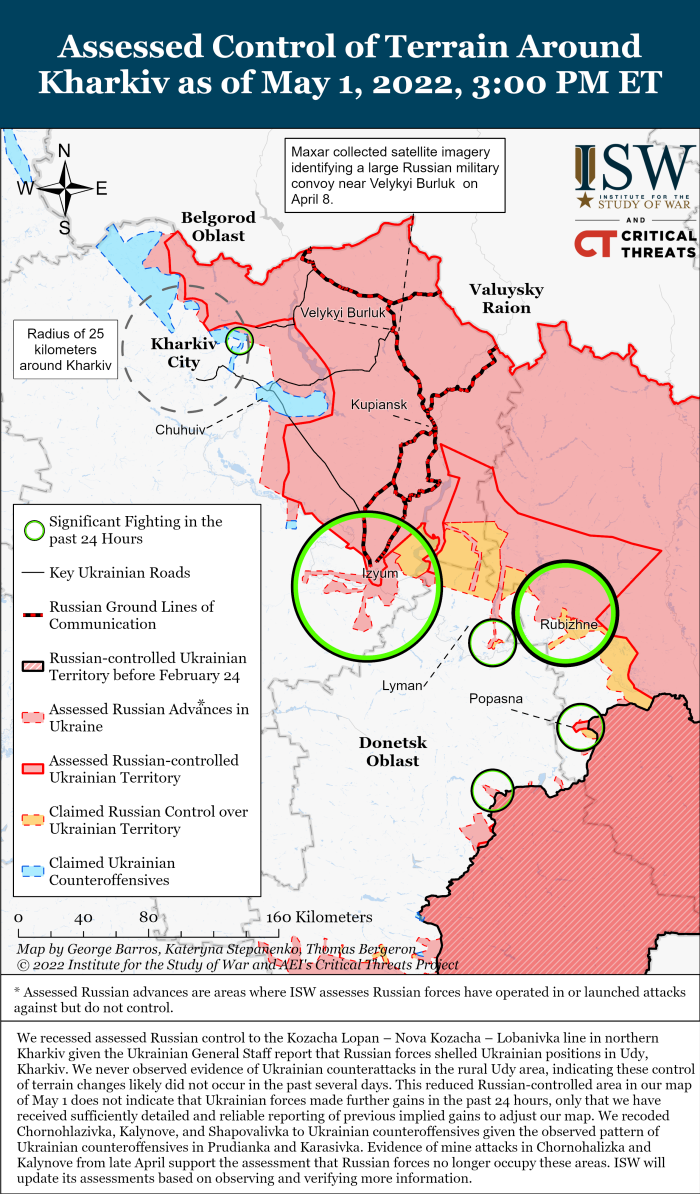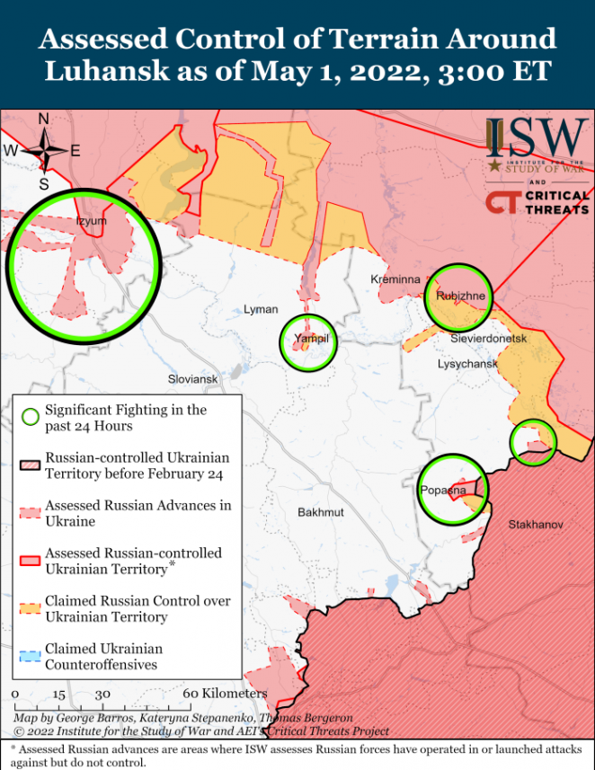 ВСУ сдерживают захватчиков, но они все же частично продвинулись на юго-запад в сторону Лимана. Они получили преимущество южнее и западнее Ямполя (15 км юго-восточнее Лимана).