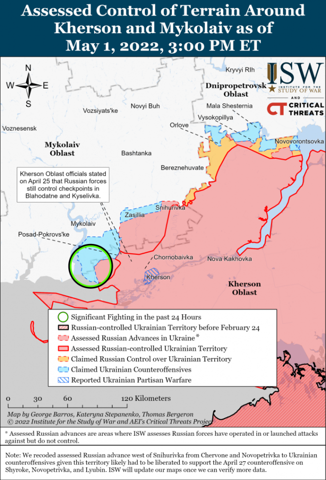 Больших наступлений не было, войска РФ перемещаются. Если РФ все же решит наступать на Николаев и Кривой Рог, по мнению экспертов, ее силы будут разделены и ситуация будет напоминать ее первоначальный провальный план вторжения в Украину.
