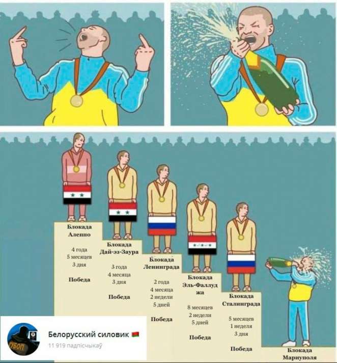 Второй скрин тоже направлен на крутость советских и других военных, и принижение стойкости и умений украинских воинов, обороняющих Мариуполь. Тут снова «память» подвела. «Блокада Сталинграда» - это вообще что-то новое в истории, но ладно. Важнее то, что Брестская крепость-герой, столь значимая для беларусского народа и на мужестве которой воспитывают несколько поколений военных, на данный пьедестал вообще бы не попала, поскольку продержалась только 32 дня (а активные боевые действия шли около 8 дней). Ладно весь Мариуполь, даже район «Азовсталь» при резком ограничении ресурсов уже около 20 дней эффективно обороняется под российскими бомбардировками и обстрелами артиллерией. Нормальный военный может ненавидеть врага, но при этом и уважает умелые действия противника. А не как подросток пытается его дискредитировать, но, не обладая знаниями и умом, дискредитирует себя или своих, как на приведенном скрине.