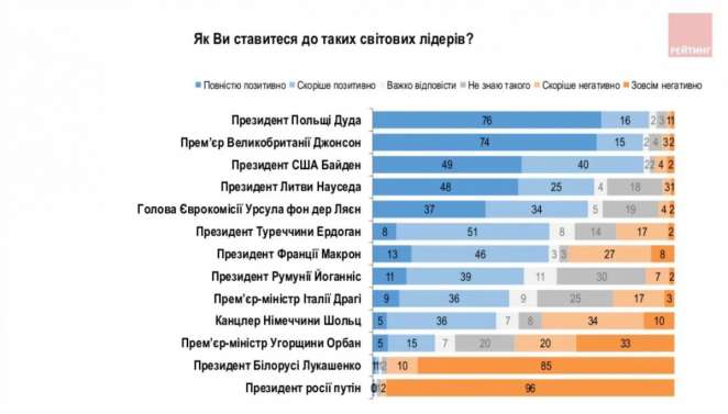 По данным опроса, президент Польши Анджей Дуда и премьер-министр Британии Борис Джонсон – иностранные руководители, к которым наблюдается самый высокий показатель положительного отношения среди украинцев – более 90% (74-76% полностью положительно, еще 15-16% – скорее положительно). К президенту США Джо Байдену положительно относятся 89%, президенту Литвы Гитанасу Науседе – 73%, президенту Еврокомиссии Урсуле фон дер Ляйен – 71%, президенту Турции Реджепу Тайипу Эрдогану – 59%, президенту Франции Эмманюэлю Макрону – 58%, президенту Румынии Клаусу Йоганнесу – 50% (не знают его – 30%), премьер-министру Италии Марио Драги – 45% (не знают – 25%), канцлеру Германии Олафу Шольцу – 41%.