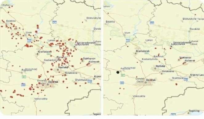 В качестве доказательств приводятся интерактивные карты, на которые аналитики наносят места обстрелов. По данным сервиса DeepStateMAP (последнее изображение), явление наблюдается по всей линии фронта.