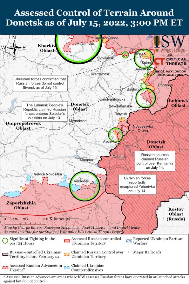 Эти атаки по-прежнему носят мелкомасштабный характер и в основном не увенчались успехом, но они могут свидетельствовать, что российские войска пытаются возобновить свои наступательные действия на Донбассе. Если оперативная пауза действительно закончилась, россияне, скорее всего, продолжат и расширят такие атаки в ближайшие 72 часа.
