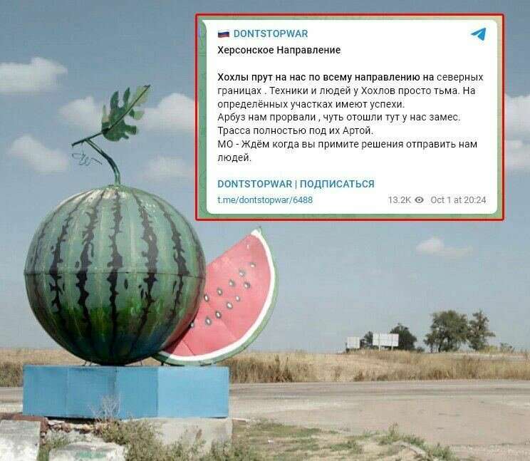 Российские фронтовые блогеры сообщили, что украинская бронетехника прорвала российскую линию обороны в районе так называемого «памятника арбузу» в районе поселения Золотая Балка.