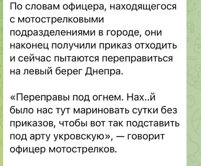 Вывод такого контингента требует времени и за один день операция не проводится. К тому же, все переправы на текущий момент взорваны или находятся под огневым контролем ВСУ.
