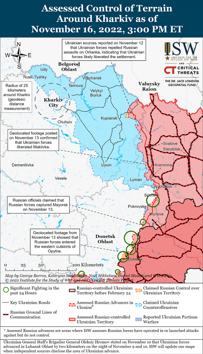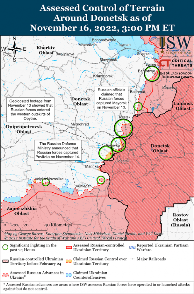Российские источники утверждали, что войска РФ взяли под свой контроль Майорск 13 ноября, а заявление Генерального штаба ВСУ предполагает, что «цена этого была высокой», что согласуется с оценкой ISW о том, что российские силы продолжат дорогостоящие операции против небольших и незначительных в оперативном отношении населенных пунктов.