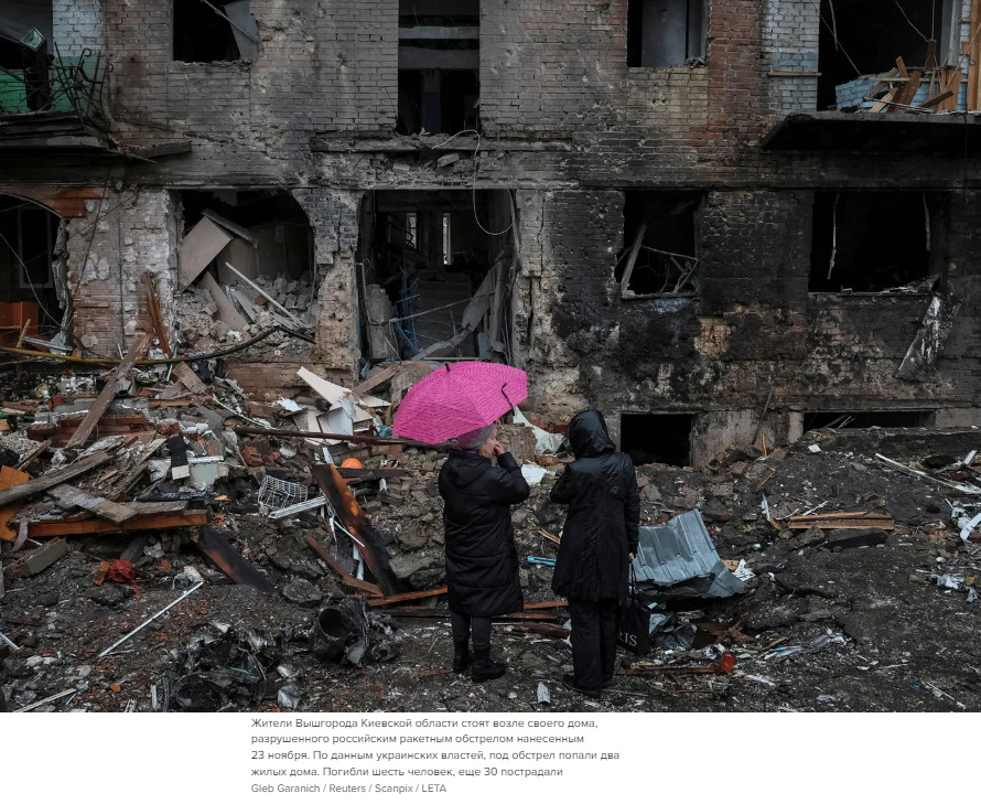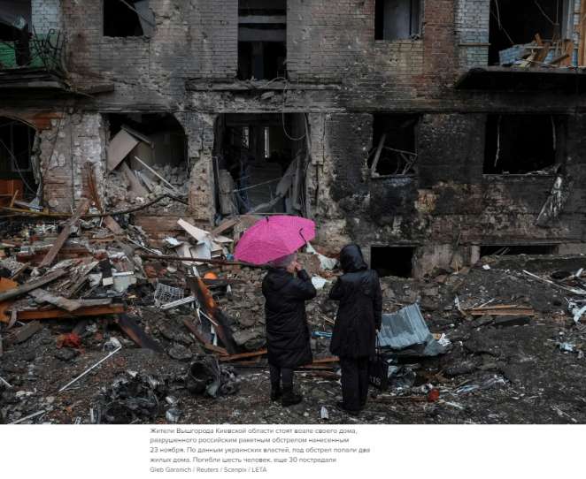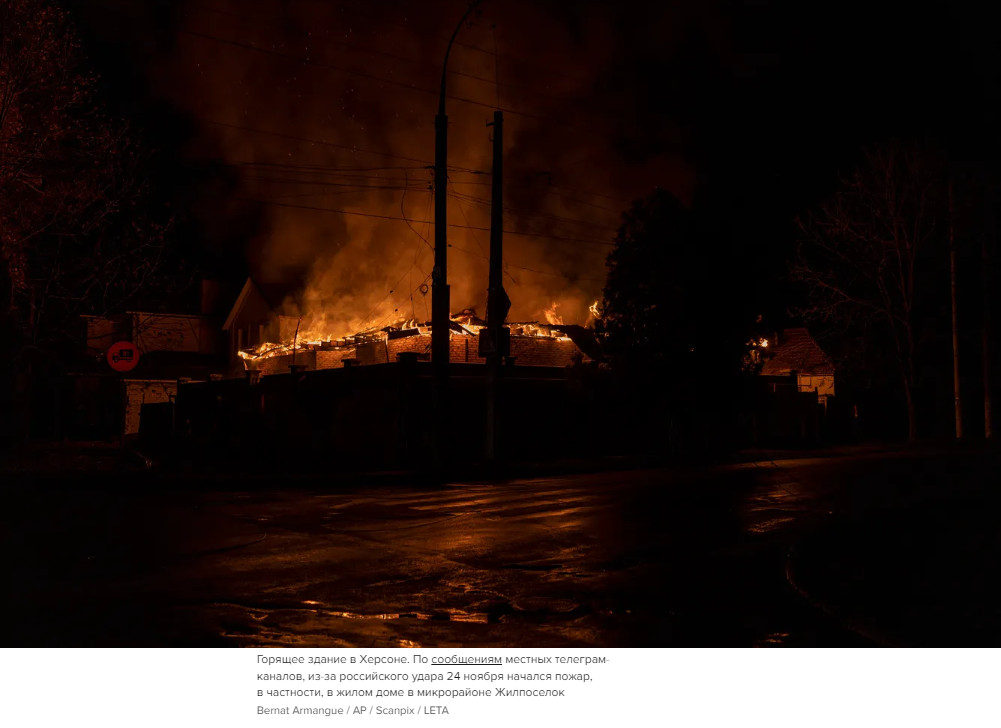 Российские войска продолжают ракетные удары по Украине: 24 ноября Херсон обстреляли 17 раз, сообщила начальник Херсонской военной администрации Галина Луговая (в области — десять погибших); в Киеве и Киевской области из-за атак половина города остается без электричества, сообщил мэр Виталий Кличко.
