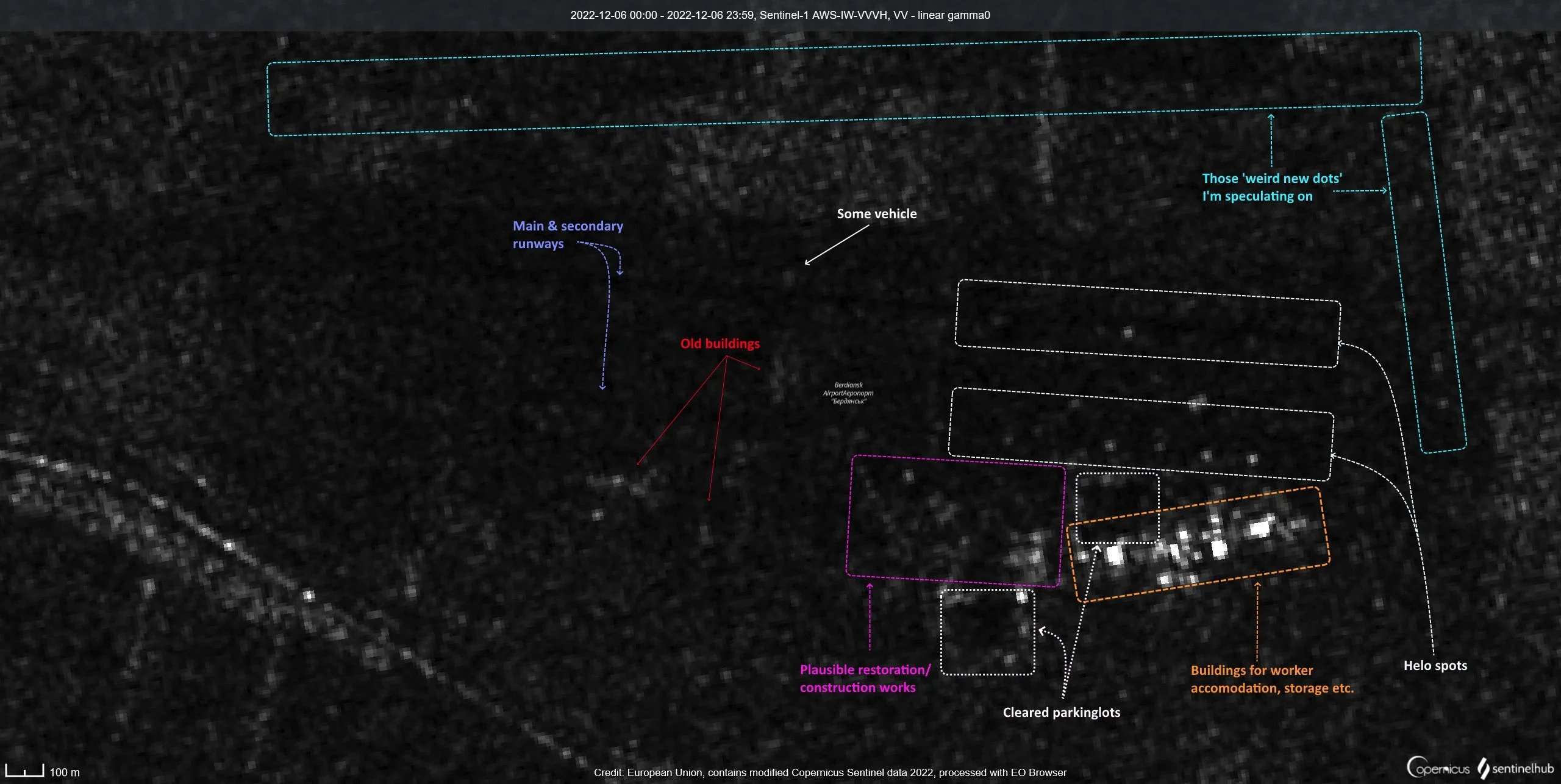 Эксперт из OSINT детально изучил спутниковые снимки из Бердянска. По его мнению, еще с конца ноября оккупанты стали расчищать территорию вокруг аэропорта, чтобы превратить ее в базу. Также он составил поэтапные планы оккупантов в районе аэропорта.