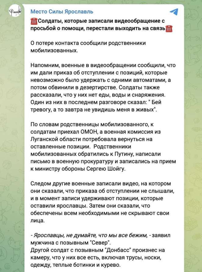 Об этом сообщили в Telegram-канале «Место Силы Ярославль» со ссылкой на родственников мобилизованных. Соответсвующий приказ об отступлении «мобикам» дали их командиры.