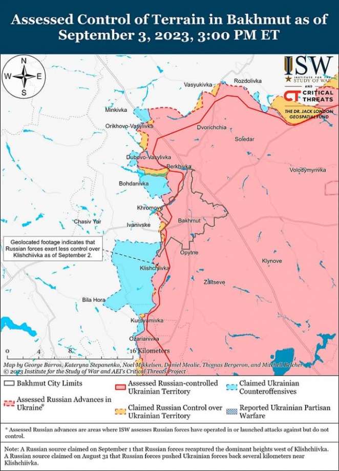 В свежем обзоре ISW отмечается, что украинские войска продолжили контрнаступательные операции и 3 сентября продвинулись вперед под Бахмутом и на западе Запорожской области. Украинский Генеральный штаб сообщил, что украинские силы проводят наступательные операции на Мелитопольском направлении.