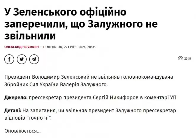 «УП» со ссылкой на источник в СНБО пишет, что указа президента пока нет, однако Валерия Залужного действительно вызвали и предлагали должность посла. Он отказался. Часть собеседников издания отрицает увольнение главкома ВСУ.