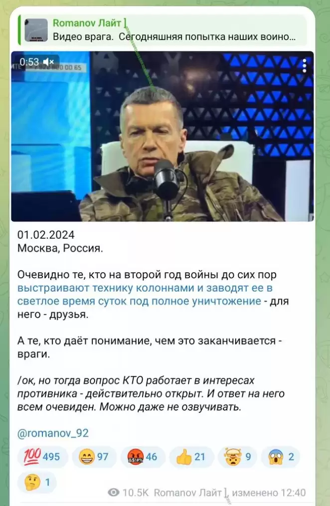 Один из российских военкоров Романов уже ответил Соловьеву в своем Telegram-канале, обругав некомпетентных российских командиров и в ответ обвинив пропагандиста в работе на противника.