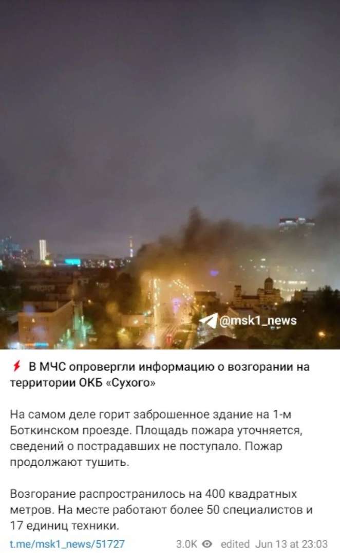 Примечательно, что в российском МЧС не говорят о пожаре именно на ДКБ «Сухого», а сообщают, что «горит неэксплуатируемое здание» на северо-западе Москвы.