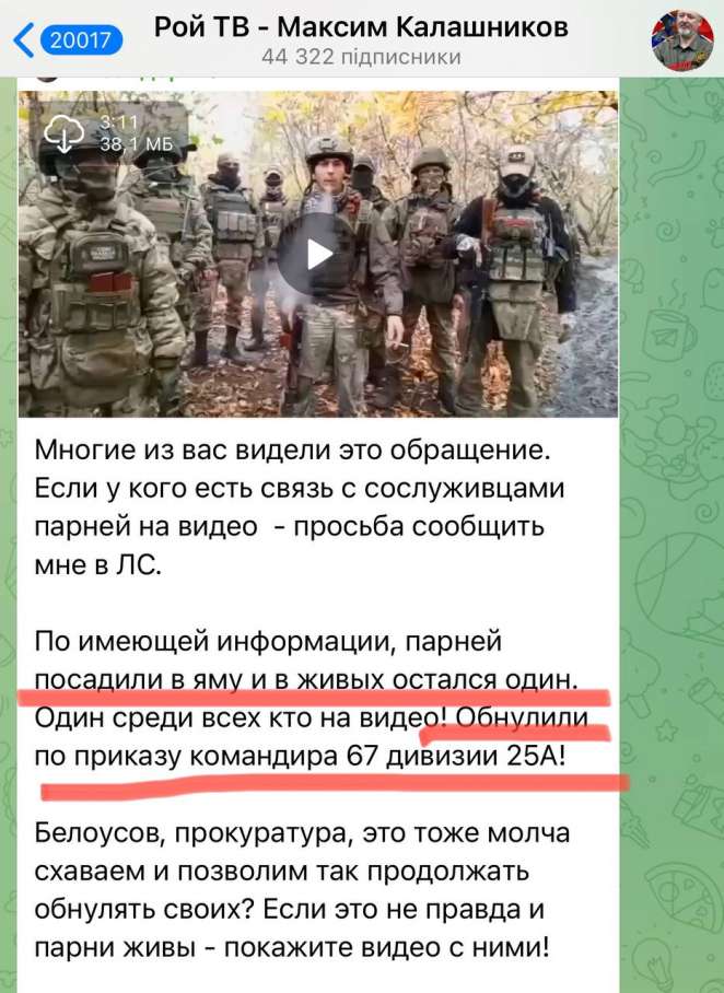 «Парней посадили в яму, и в живых остался один. Один среди всех, кто на видео! Обнулили по приказу командира 67-й дивизии 25А!» - возмущается один из российских Z-блогеров.