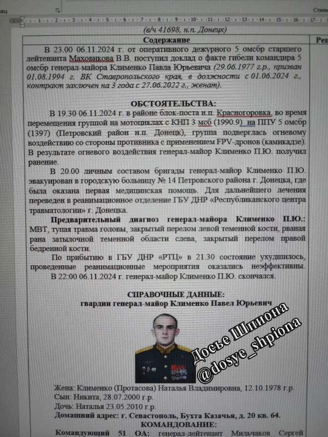 Колонну разбили с помощью FPV-дронов. Клименко получил тяжелые травмы головы и был срочно отправлен в центр травматологии в Донецке, но через несколько часов умер.