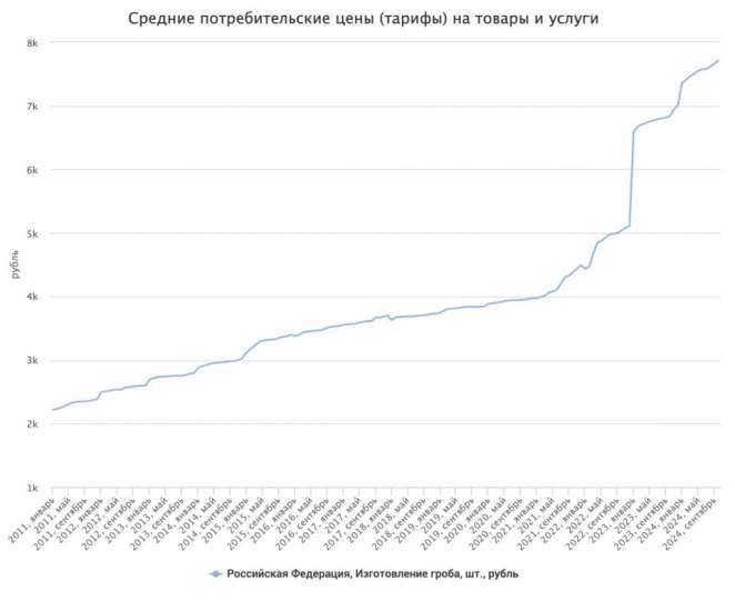 Так, в октябре 2024 года гроб в среднем по РФ стоил 7711 рублей против 4437 рублей в январе 2022-го.