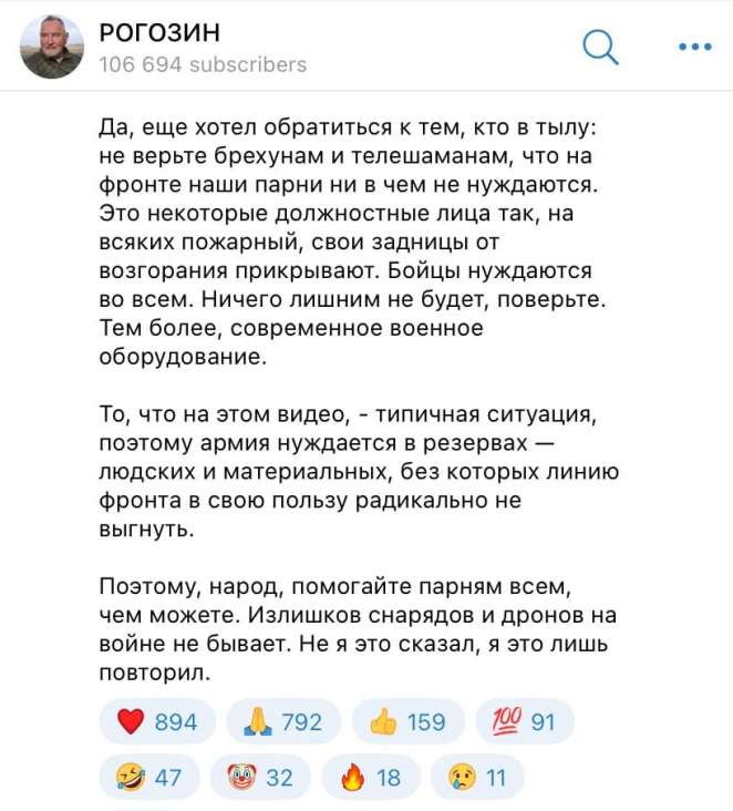 «Да, еще хотел обратиться к тем, кто в тылу: не верьте брехунам и телешаманам, что на фронте наши парни ни в чем не нуждаются. Это некоторые должностные лица так, на всяких пожарный, свои задницы от возгорания прикрывают. Бойцы нуждаются во всем» - написал Рогозин.