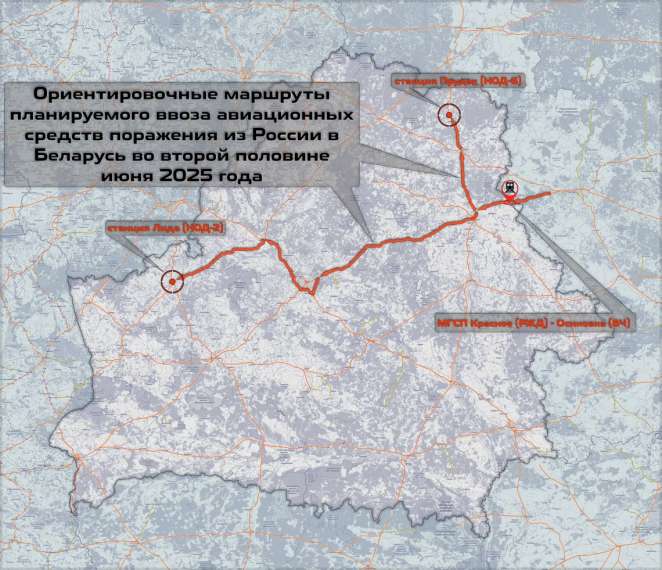 Ориентировочные железнодорожные маршруты ввоза авиационных средств из России в Беларусь во второй половине июня 2025 года. Фото: belzhd.info
