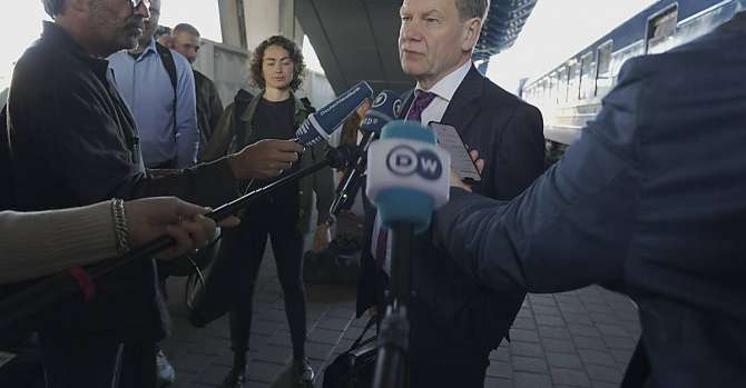 По прибытии он заявил, что «свобода и будущее Украины являются важнейшей задачей» внешней и безопасности политики Германии. Также глава МИД Германии заявил, что глава Кремля Владимир Путин пытается подчинить Украину жестокими бомбардировками.