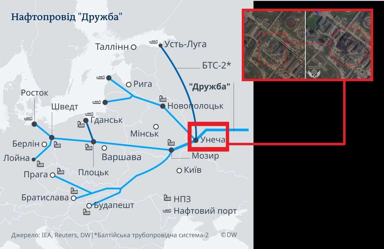 «Унеча» - один из ключевых узлов 5500-километрового нефтепровода «Дружба», который обеспечивает поставки нефти в белорусский Мозырь и к российскому порту Усть-Луга. Станция способна прокачивать до 60 млн тонн нефти в год, и её повреждение ставит под угрозу регулярность экспорта и снабжения союзной Беларуси.