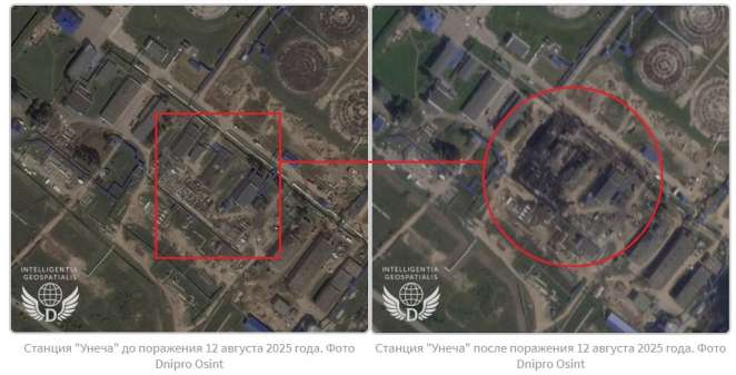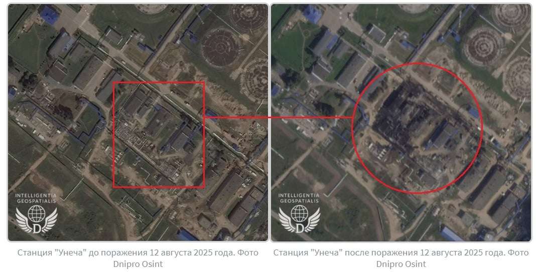 12 августа около 22:00 по «Унече» был нанесен комбинированный удар, по словам местных властей, использовались HIMARS и ударные дроны. В результате сгорели две насосные станции, техническое здание и прилегающее оборудование. Пожар подтвердили и спутниковые данные NASA, фиксировавшие очаги возгорания вплоть до утра следующего дня.