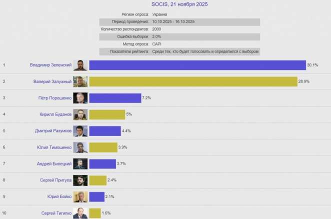 Последние данные, опубликованные на прошлой неделе исследовательской группой «Рейтинг», показывают, что Владимир Зеленский сохраняет минимальное преимущество над Валерием Залужным. В опросе, проведенном с 10 по 16 октября 2025 года (2000 респондентов, погрешность 2%), за Зеленского готовы проголосовать 30,1% тех, кто определился с выбором, тогда как за Залужного – 28,9%.
