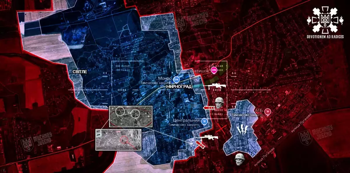 «Противник продавливает юго-восточную часть Мирнограда, перерезал выход из микрорайонов для части наших подразделений», - признался военный, добавив, что часть частного сектора, в который прорвались оккупанты, превратилась в «серый мешок», в нем нет контроля и пространства для маневра.
