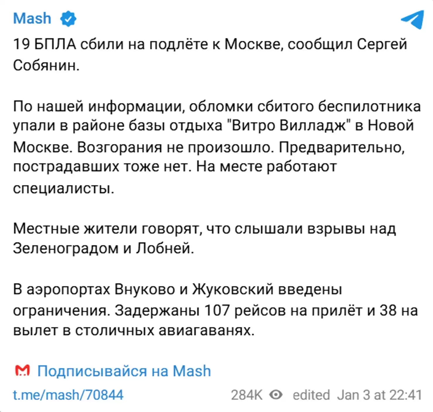 По данным медиа Mash, взрывы также были слышны над Зеленоградом и Лобней. В московских аэропортах «Внуково» и «Жуковский» введены ограничения из-за налета дронов: всего известно о задержании 107 рейсов на прилет и еще 38 на вылет.