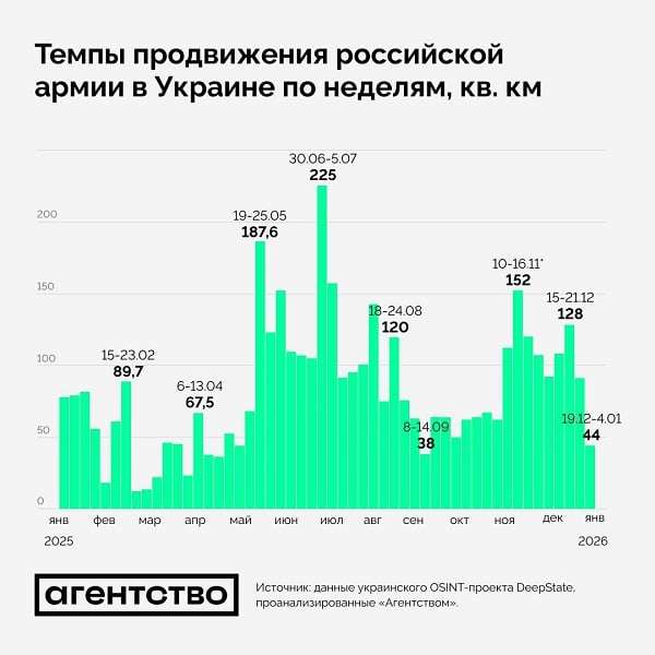 6 января стало известно, что скорость наступления армии РФ в Украине упала до минимума: за минувшие 7 дней враг захватил всего 44 км² территории, в зонах возле Константиновки, Северска и, конечно же, Покровска. Показатели меньше были только в сентябре 2025 года (38 км²). Об этом сообщило издание «Агентство».