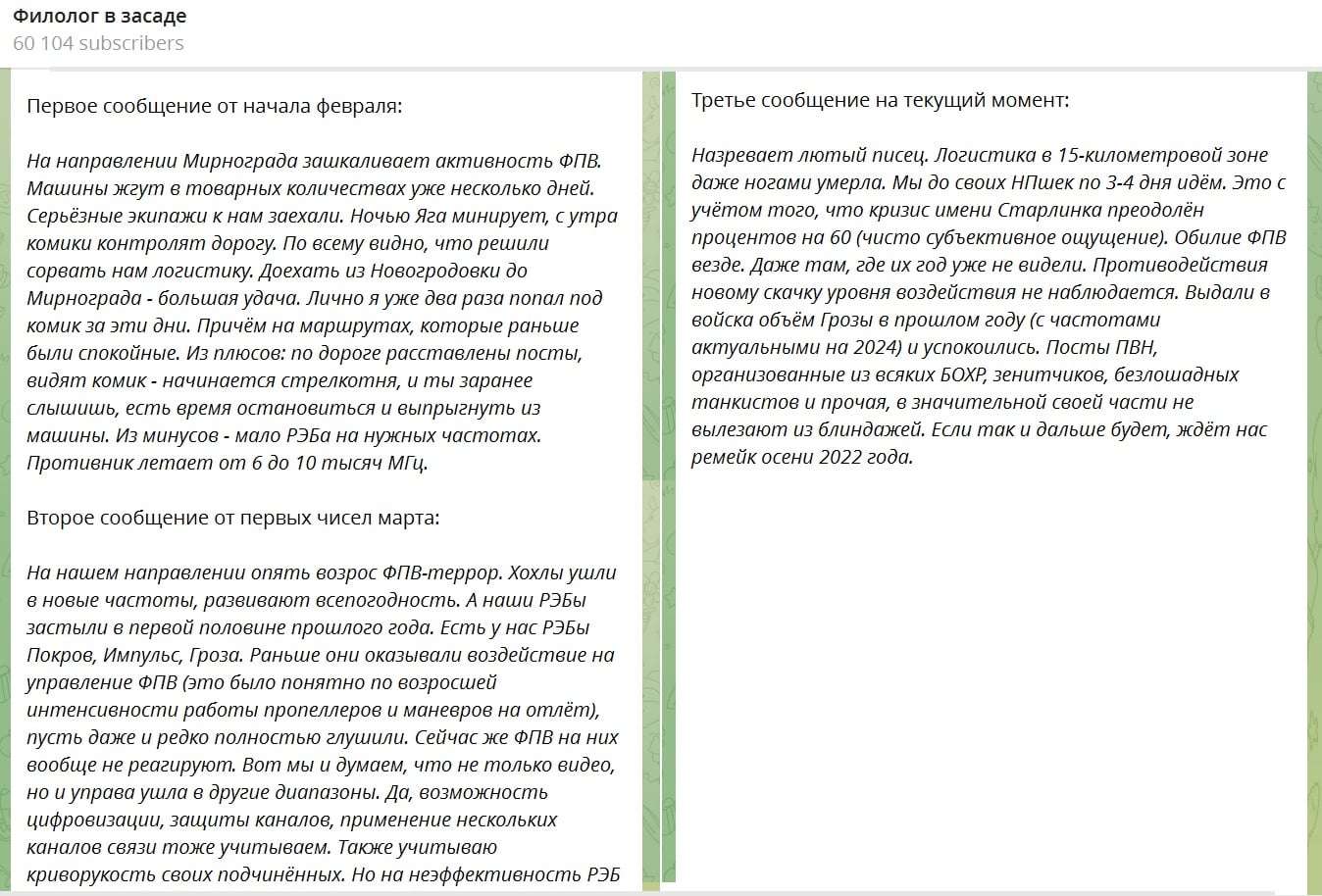 По словам самих российских источников, украинские операторы дронов перешли на новые частоты и улучшили защиту каналов связи. В результате FPV-дроны практически не реагируют на российские средства подавления.
