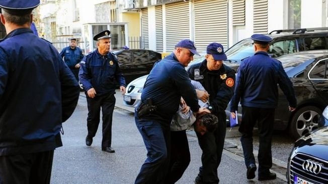 Черногорские полицейские ведут задержанного по улице. Фото ВВС