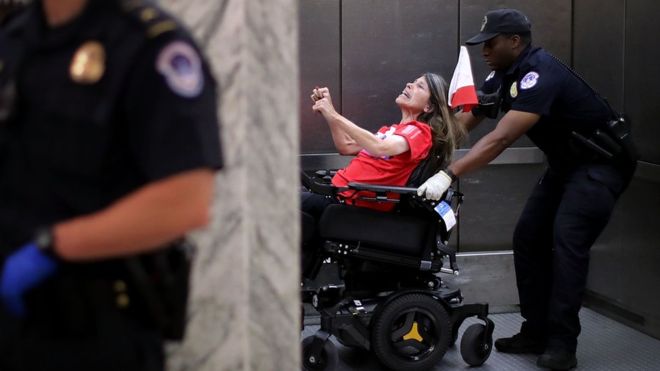 Участников акции протеста, многие из которых были в инвалидных колясках, насильно вывели из комнаты для слушаний.