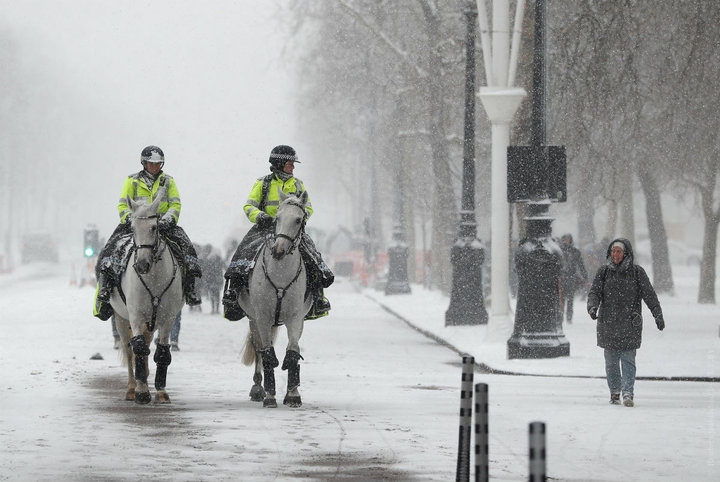 Конная полиция патрулирует заснеженный Лондон. 28 февраля 2018 года. Фото: Reuters