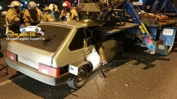 Выпирающая часть конструкции грузового автомобиля буквально срезала крышу легковушки. Согласно официальным данным, водитель был доставлен в больницу с травмами различной степени тяжести. Пассажир скончался от "травм, не совместимых с жизнью".