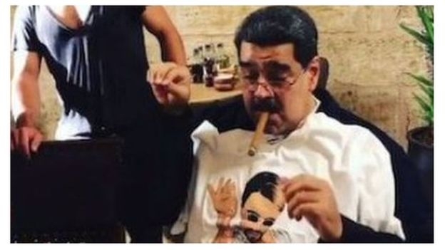 На других видео президент Мадуро курит сигару из коробки, на которой выгравировано его имя, а Силия Флорес держит футболку с изображением шеф-повара.