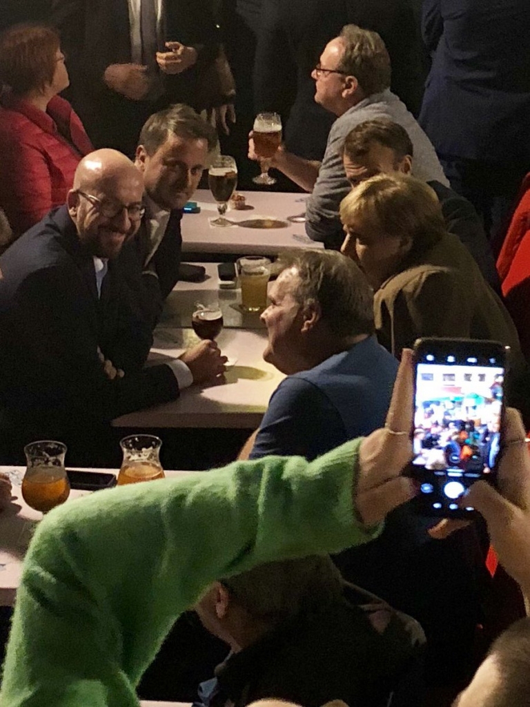 Меркель и Макрон общались с туристами и местными жителями, обмениваясь с ними рукопожатиями. Премьер Люксембурга Ксавье Беттель рассказал, что он купил напитки, чтобы отпраздновать свое переизбрание.