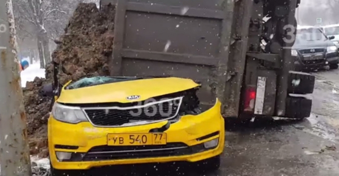 Шок! Самосвал с песком раздавил такси с пассажиром в Москве