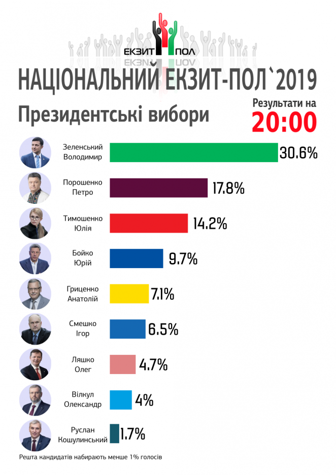 Шоумен Владимир Зеленский сохранил лидерство с 30,6% голосов. На втором месте находится действующий президент Петр Порошенко с 17,8%, а на третьем лидер Батькивщины Юлия Тимошенко с 14,2%.