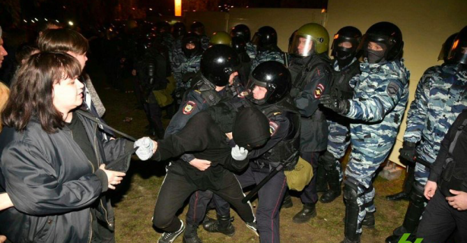 Молодые люди, которых протестующие называют провокаторами, кидают в силовиков петарды, также звучали выкрики «Слава Украине». Перед шеренгой сотрудников ОМОН встали люди в масках. Силовики выстроились в три ряда, кто-то из них, как пишет «МБХ Медиа», распылил газ. В автозаки увели не менее восьми человек, на одного из них надели наручники, сообщает «ОВД-Инфо».