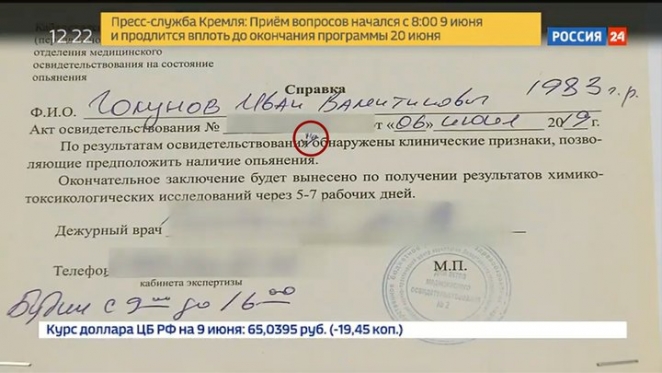 Госканал “Россия 24“ объявил, что при задержании Голунов был пьян. И показал документ, что не был