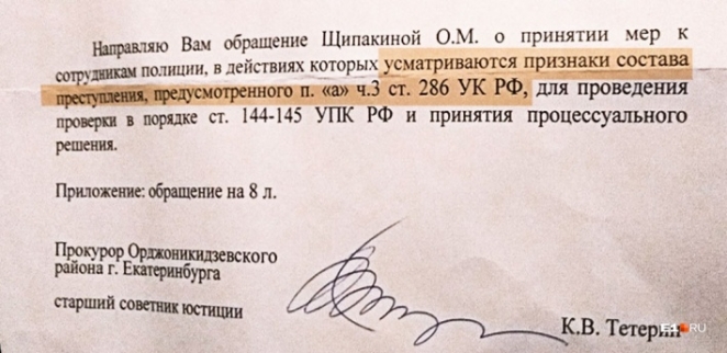 Ответ от прокуратуры, где сообщили, что информацию об избиении передадут в следственный комитет. Фото: Оксана Щипакина / E1.RU