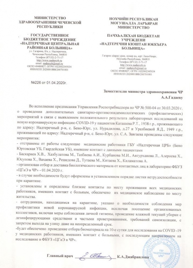 Дело в том, что в Чечне уже в нескольких районах закрыли на карантин все больницы (ЦРБ, поликлиники и даже ФАПы — фельдшерские амбулаторные пункты, которые обеспечивают население неотложной медицинской помощью). Например, с 1 апреля в Надтеречном районе были закрыты медучреждения, а врачи отправлены в неоплачиваемый отпуск, после того, как у двух жителей села Бено-Юрт был выявлен коронавирус. 10 апреля аналогичная участь постигла больницы Шелковского района.